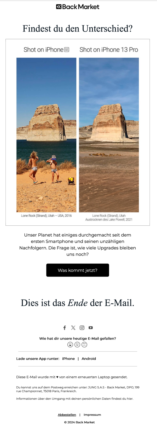 Auch mein Postfach quillt über von Werbemails. Die meisten landen direkt im Mülleimer. Hier ist eine leuchtende Ausnahme. Diese Mail stammt von Backmarket, einer Platform auf der man geprüfte und überholte gebrauchte Smartphones und Macbooks kaufen kann. Auch mein aktuelles iPhone habe ich dort gekauft (bin sehr zufrieden, wie neu, zum halben Preis...).