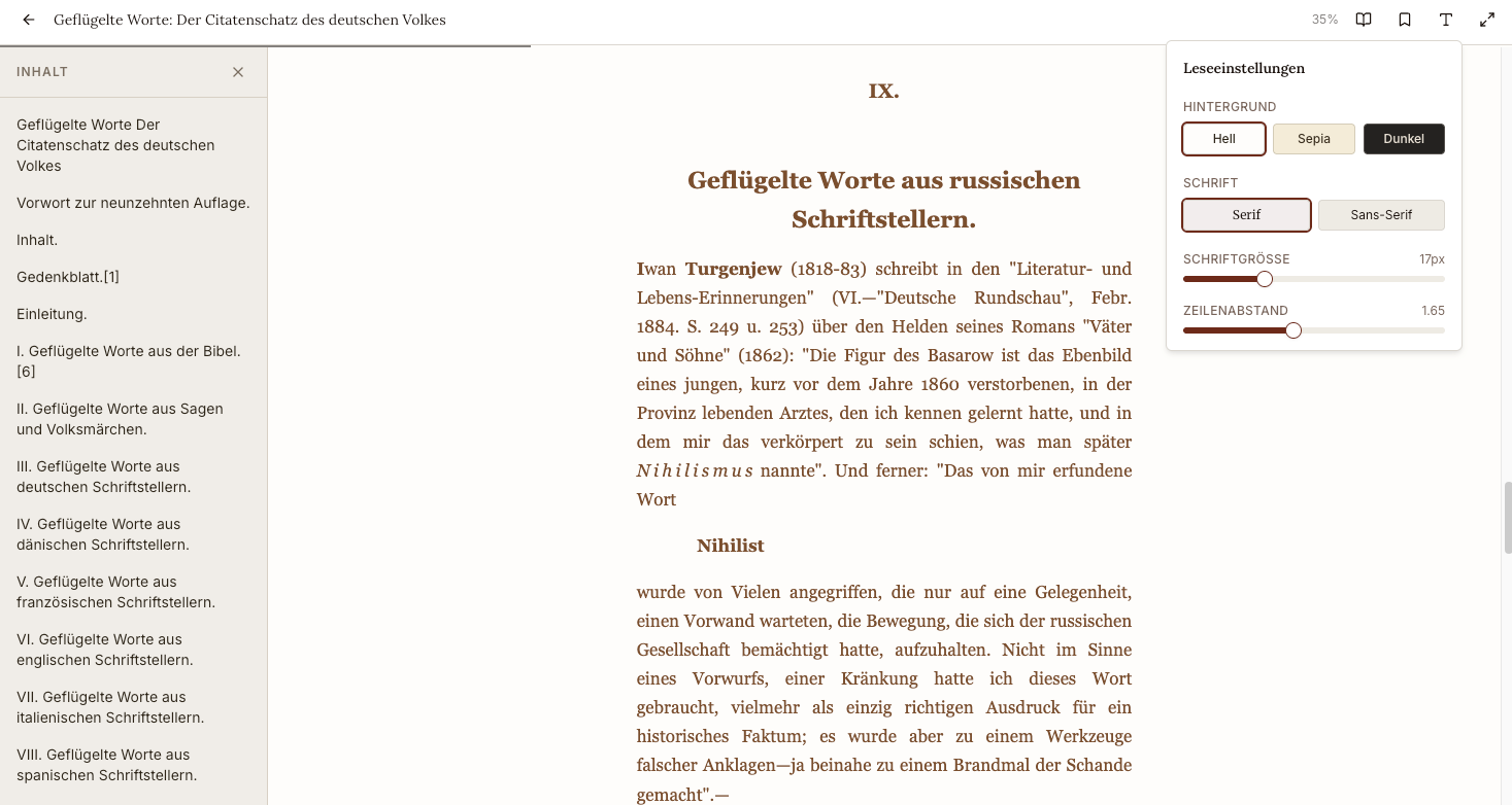 Ich lese gerne, auch alte Bücher, auch online; für deutschsprachige Bücher aus dem Projekt Gutenberg bin ich aber nie mit den angeboten Lesemöglichkeiten und dem "finden" von lesenswerten Büchern glücklich gewesen. Jetzt habe ich mein eigenes Interface, so wie ich es mir schon immer gewünscht habe. Die Vorschauen zeigen beim Hovern sofort einen kurzen Klappentext, in der Reader-Ansicht kann ich auswählen zwischen Scrollen und Blättern, die typografischen Einstellungen und die Textbreite sind so, wie ich sie als Leser angenehm empfinde und über das Inhaltsverzeichnis kann ich ein Buch schnell erschliessen. Ausserdem wird die Bibliothek per Default in einer Zufallssortierung angezeigt - es tauchen also immer wieder Bücher im Blickfeld auf, die sonst auf den hinteren Rängen verschwinden würden.