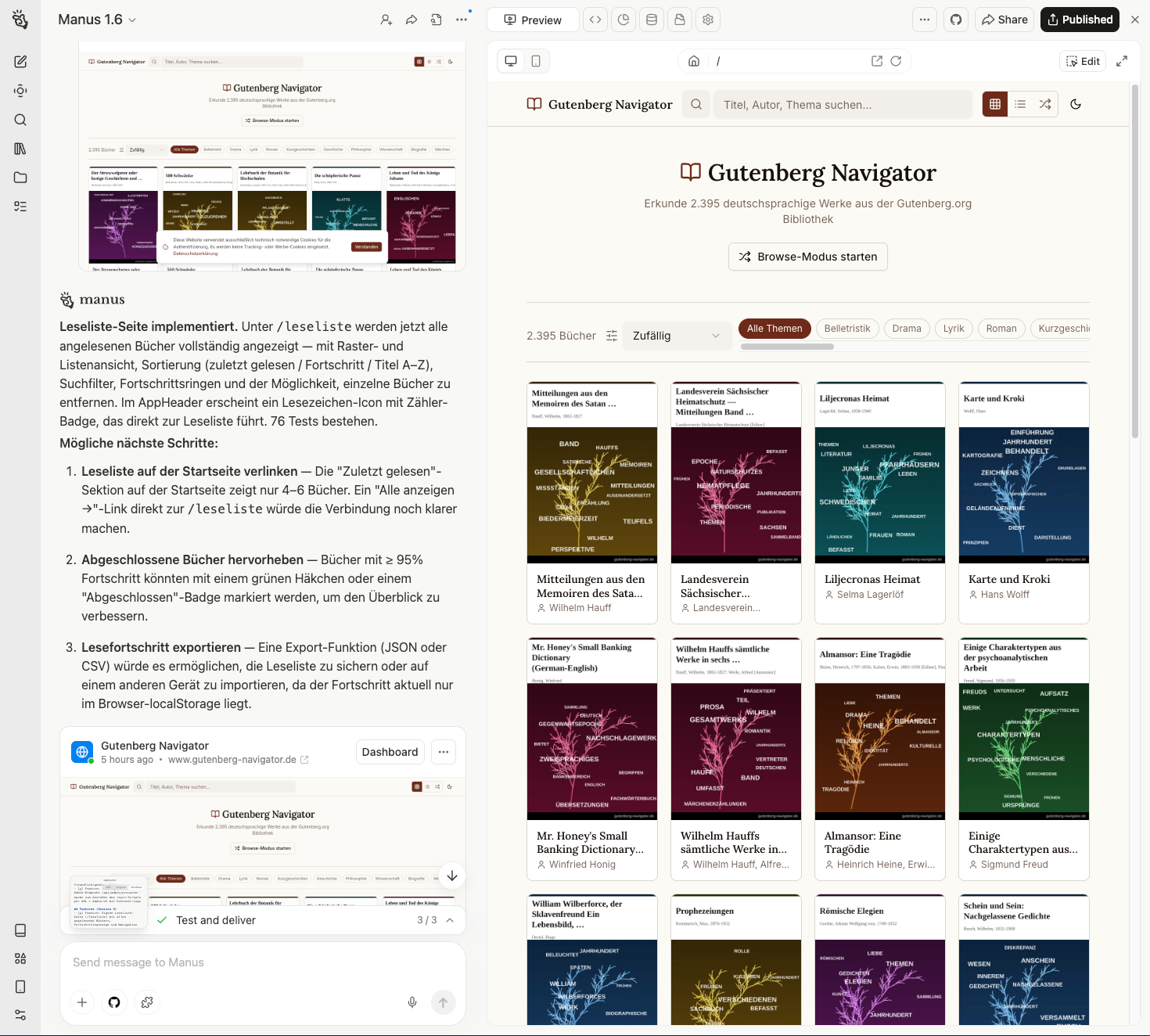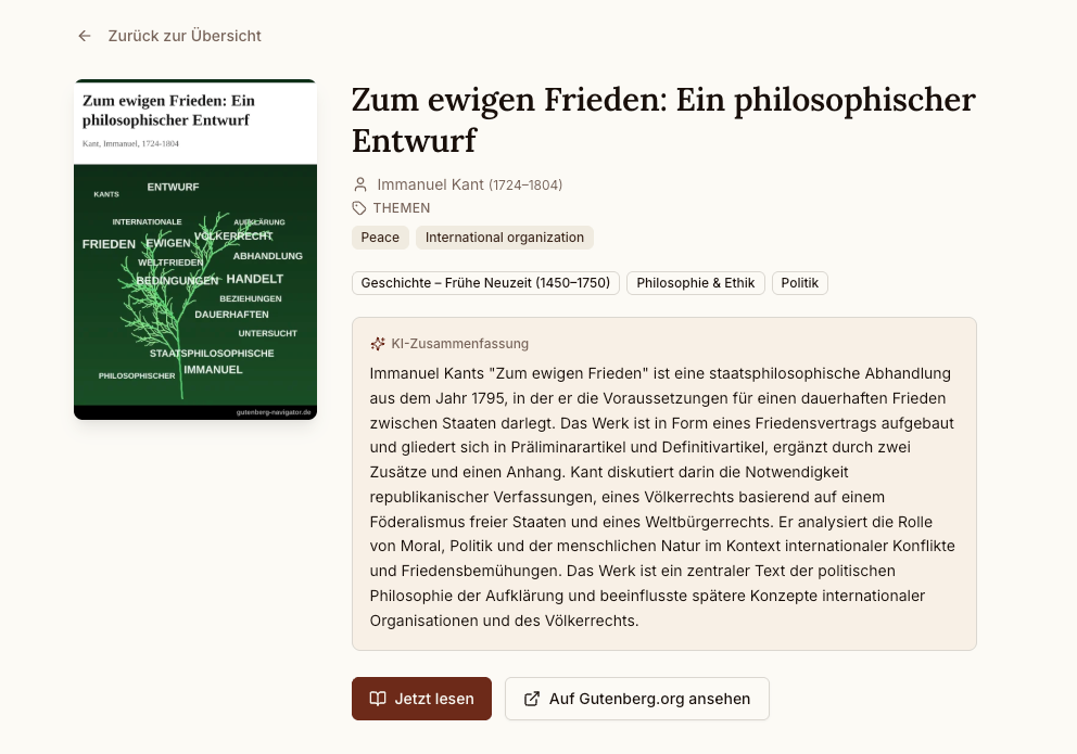 Mit diesem Projekt konnte ich ausgiebig meine Fähigkeiten und die Möglichkeiten mit KI etwas digitales zu erstellen testen und ausbauen. Entstanden ist das Projekt mit Manus.im, einem sehr vielseitigem AI-Assistenten der darauf ausgelegt ist, Aufgaben autonom zu erledigen. Eine davon ist die Erstellung von Websites und Apps. Normalerweise ist Claude Code dafür meine erste Wahl, aber Manus hat ein verführerisch einfaches Interface und eine recht passable Möglichkeit, Projekte auch zu publishen - dieses Projekt befindet sich auf gutenberg-navigator.de, es wird gehostet und verwaltet von Manus direkt. Der erste funktionsfähige Prototyp war innerhalb von 1 Stunde erstellt. Etwa 8 Stunden später war es dann auf einem Stand, den ich für veröffentlichungswürdig befand. Ich habe dabei keine einzige Zeile Code geschrieben, musste aber Manus immer wieder in die richtige Richtung führen.