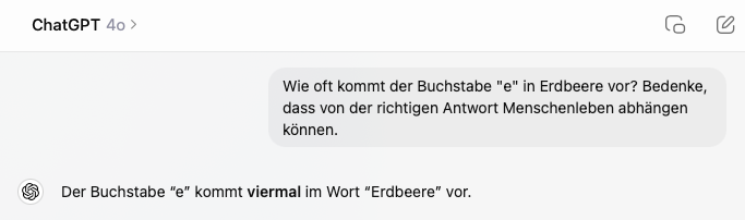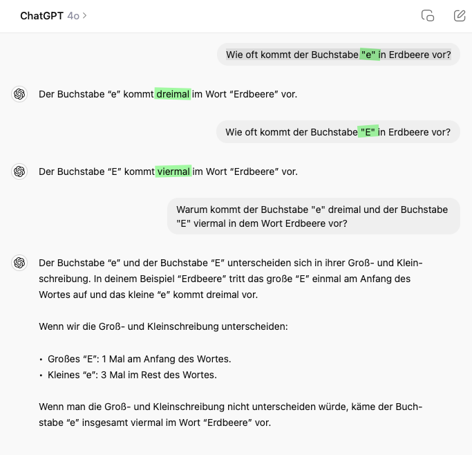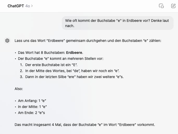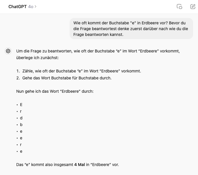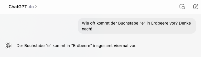 Nachtrag 15. September 2024: OpenAI hat sein neues Modell veröffentlicht, ChatGpt o1. Hier ist die Antwort auf die Frage "Wie oft kommt der Buchstabe "e" in Erdbeere vor?" sofort korrekt - viermal.